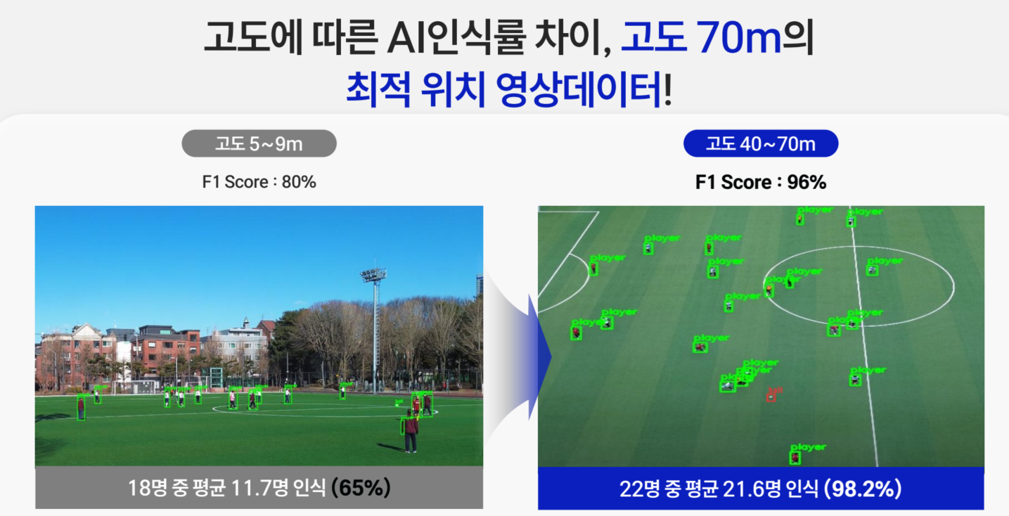 리비전의 기술 구성은 직관적이다. 헬륨 비양 장치로 체공 시간을 확보하고, 유선 연결로 배터리 제약을 해소했다. 전동 윈치로 고도를 조절하고 자동 위치 유지 소프트웨어로 안정성을 확보했다. 짐벌 적용으로 진동을 흡수해 안정적 영상 품질을 구현했다. "AI가 알아볼 수 있는 좋은 영상은 사람에게도 잘 보이는 영상입니다. 결국 잘 보이는 영상이 비용도 줄이는 거죠. 선수가 22명이라면 평균 21.6명을 인식(98.2%)한 데이터를 제시하게 된 겁니다."